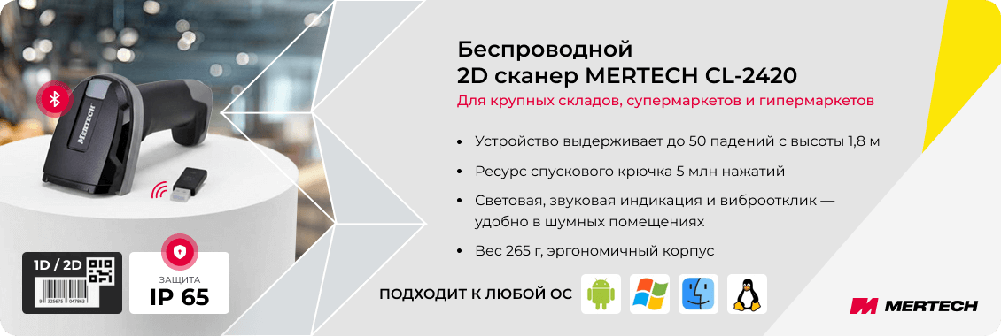 MERTECH CL-2420 BLE SPP — беспроводной 2D-сканер для складов, розницы и пунктов выдачи заказов. Модель ориентирована на работу в условиях высокой мобильности и интенсивного товарооборота, где важны стабильная связь, точное считывание и защита от внешних воздействий.